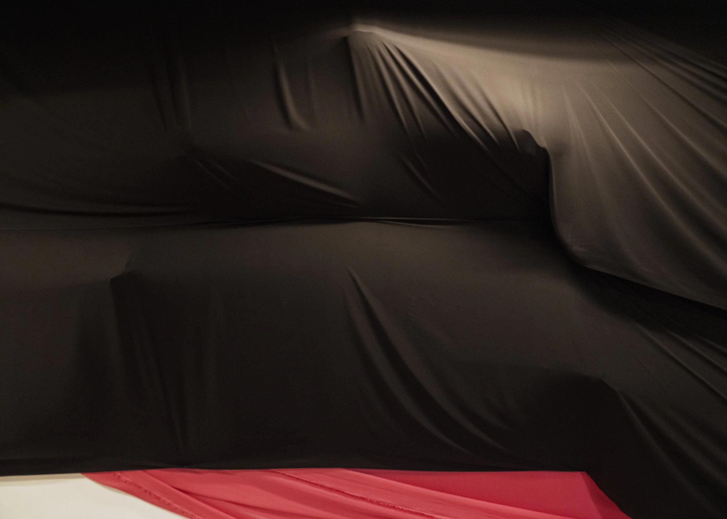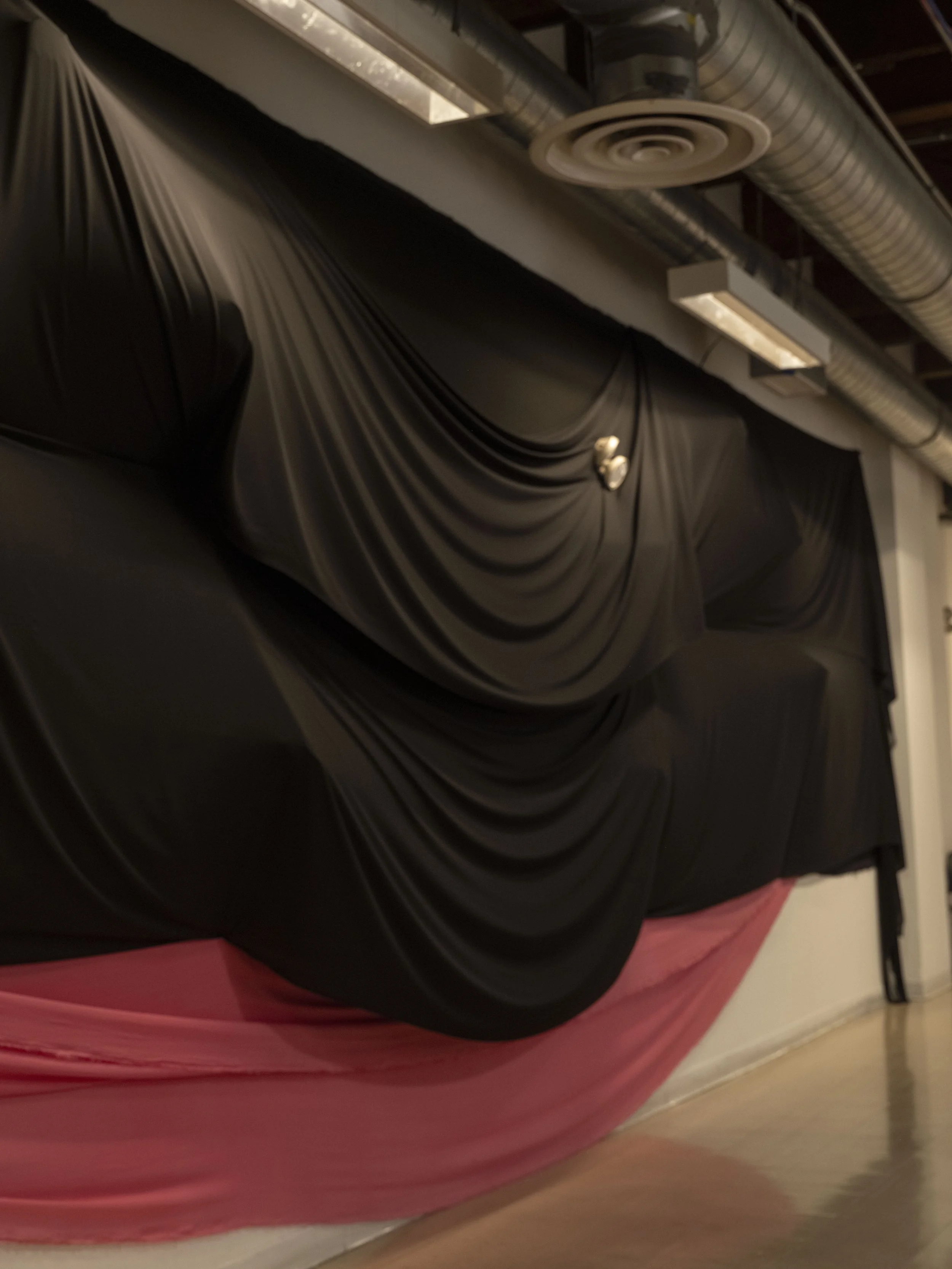 chicken wire, paper mache, spray paint, black fabric, pink fabric, neon lights, installation details, 2024
